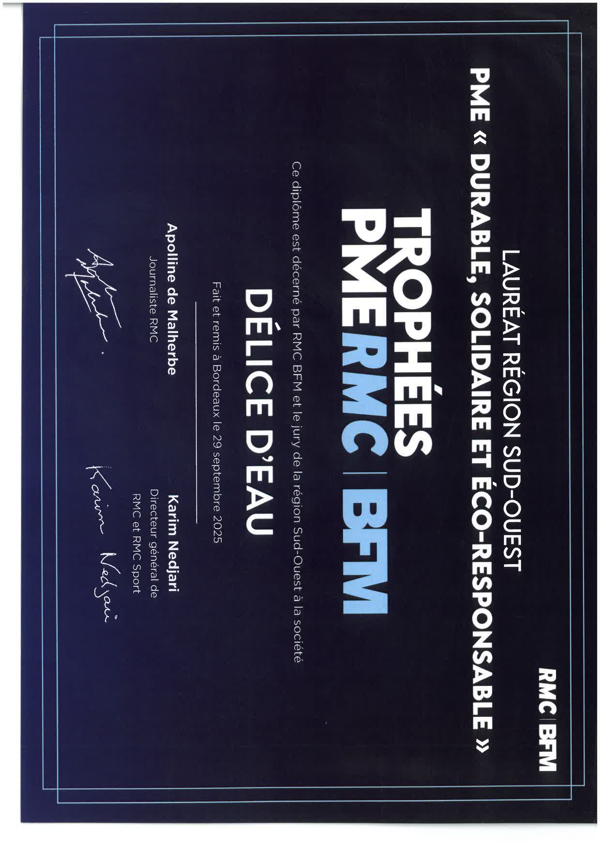 Délice d'Eau, lauréat Région Sud-Ouest du Trophée PME RMC BFM : Une reconnaissance pour notre engagement durable et solidaire !